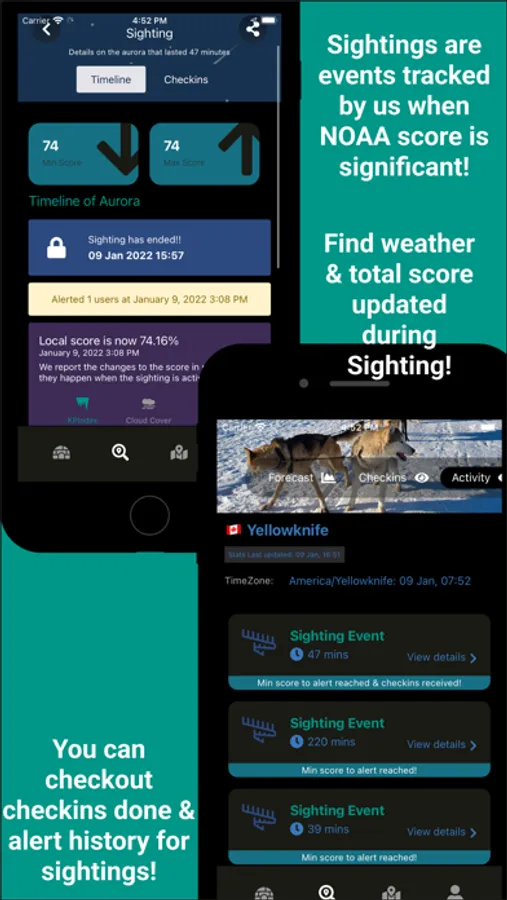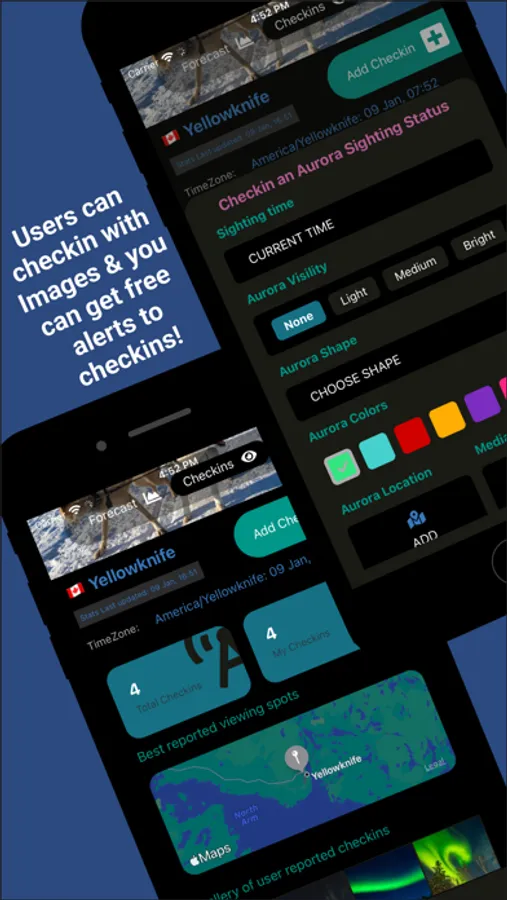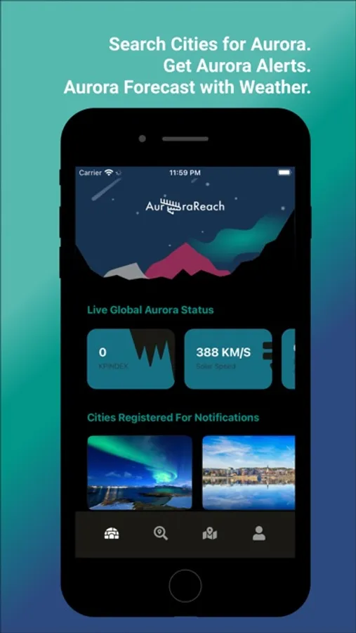 AuroraReach app is an aurora tracking, forecasting and alerting app that gives local aurora visibility scores for cities around the world. We take weather conditions like cloud cover, visibility, time of day etc. along with aurora score to generate a score that can help you find the aurora visibility times for a gives city. Along with aurora, weather conditions are also predicted for up to 4 days. We also let users checkin an aurora sighting and alert based on that.