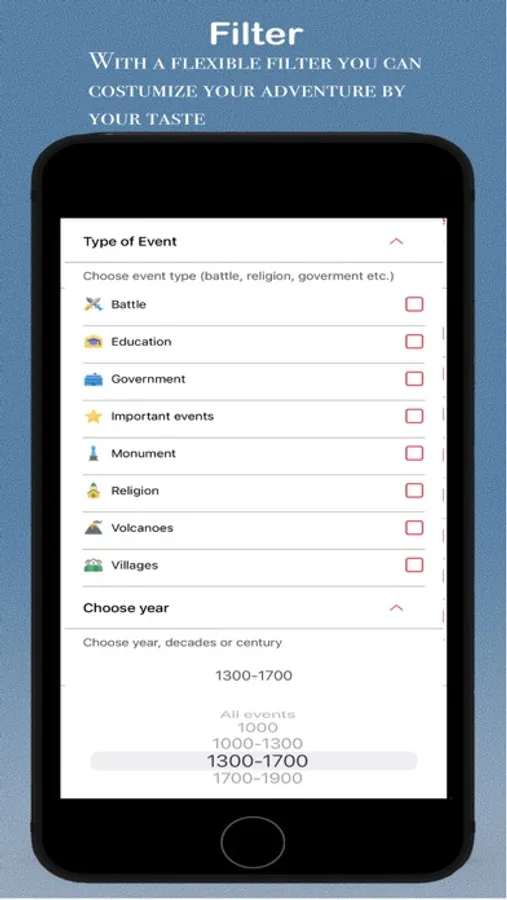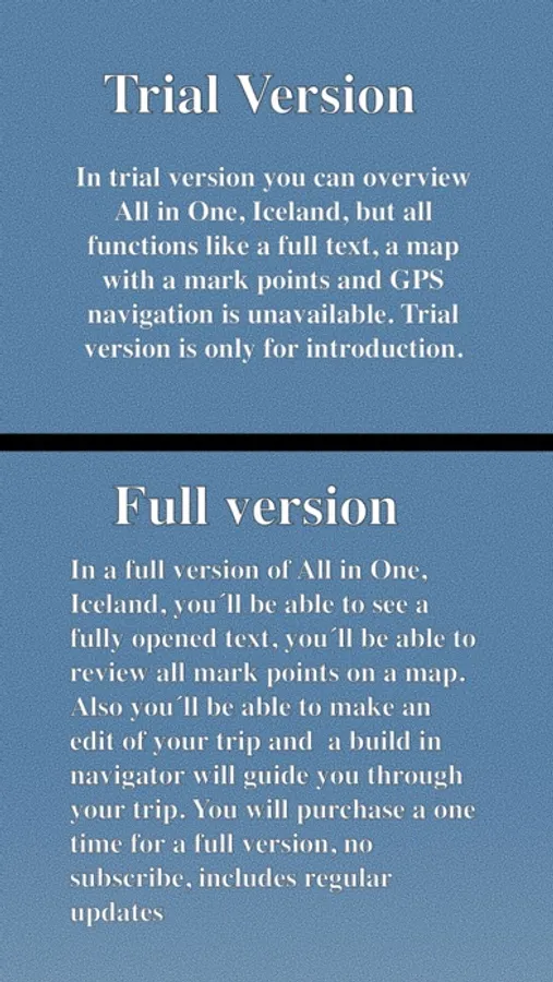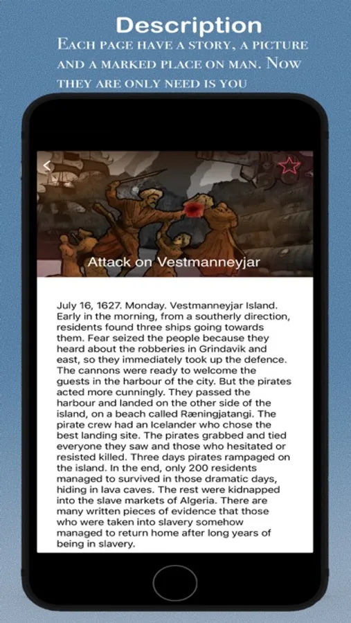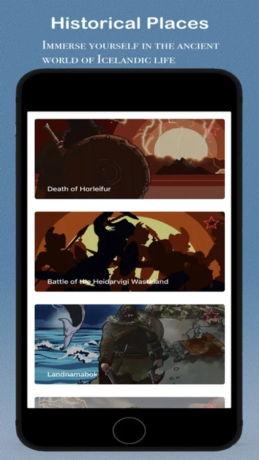 The application contains the main highlights of Iceland's history. You will be able to visit the places, in which the history of the distant island was forged. From the places of bloody battles, the most ancient parliaments, old temples, places where witches were burned, former cities and events that disappeared in time, now you can visit and see them.