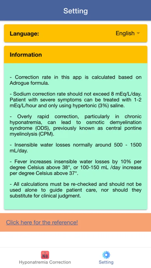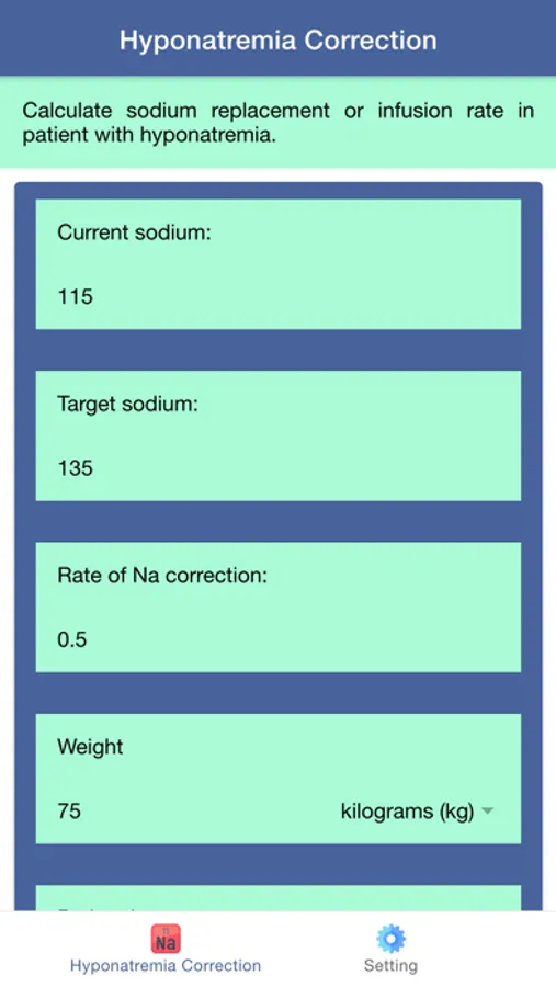 Disclaimer: all calculations must be re-checked and should not be used alone to guide patient care, nor should they substitute for clinical judgment. Calculations in this "Hyponatremia Correction Rate: Sodium Tracker" app might be different with your local practice. Consult to expert doctor whenever necessary.