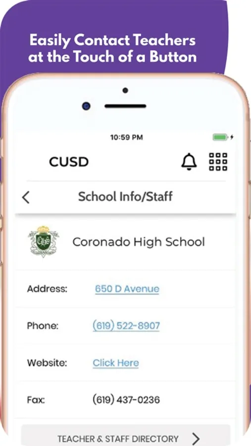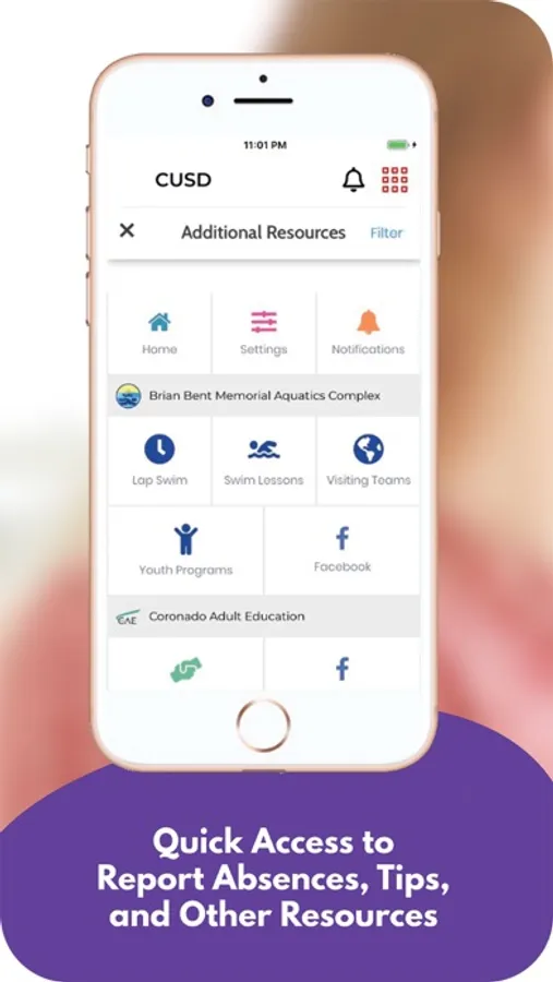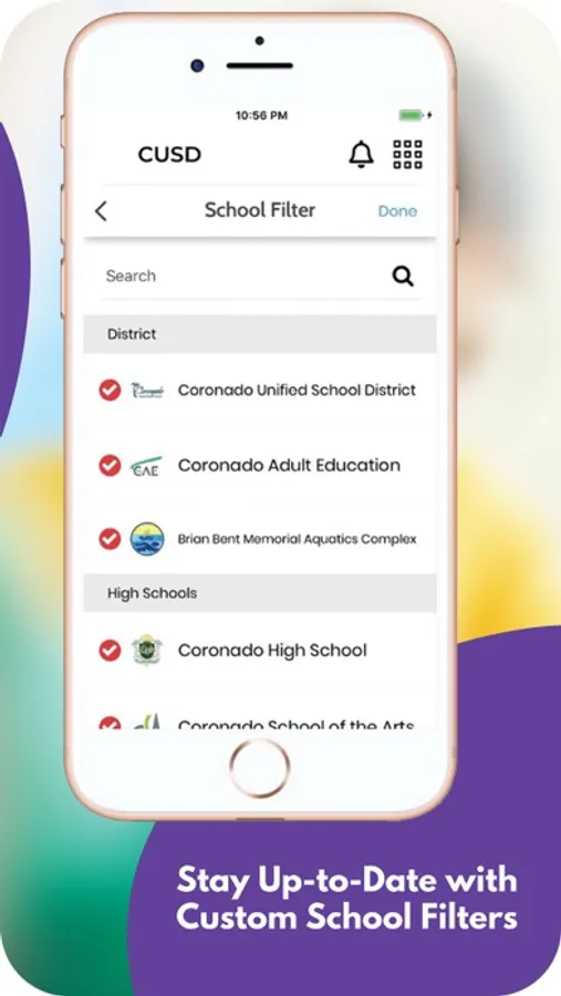 The app includes information for the district and all schools. Filter by the school your child attends to feature information for that school.