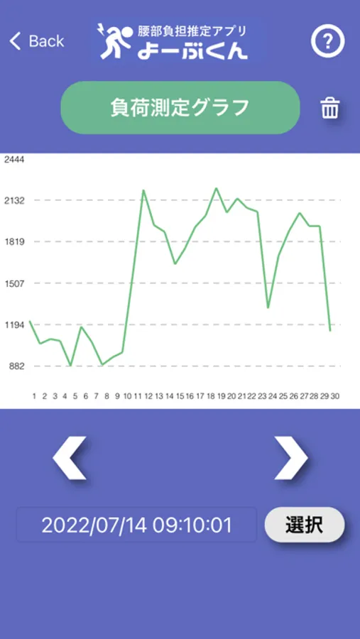 また、複数回計測することにより、腰部に掛かる負荷(N)の推移グラフを表示します。