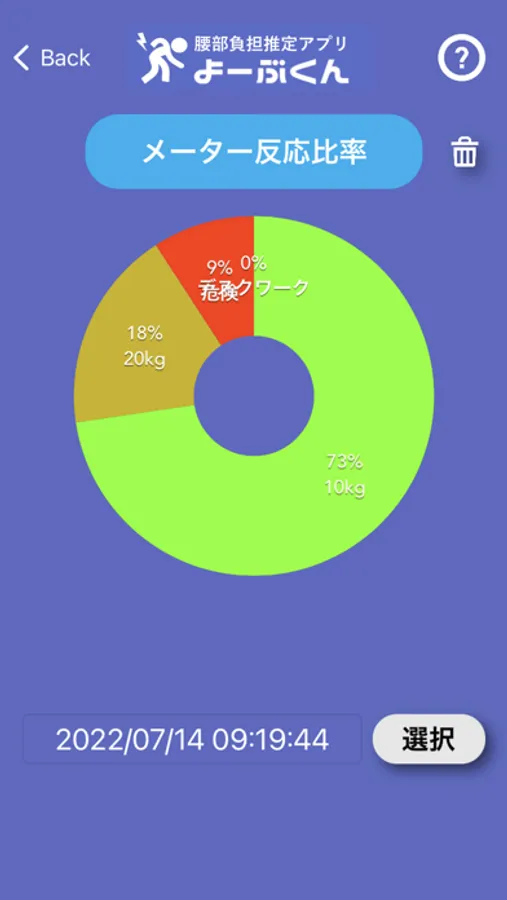 物を持った際に掛かる腰部への負荷を比率(デスクワーク程度、10kg負担、20kg負担、腰部負担危険域)で表現する事で、注意喚起として周知する事を目的としています。