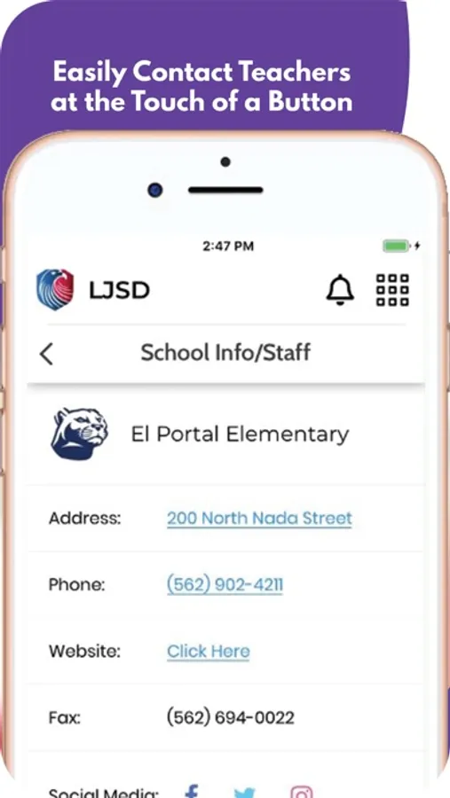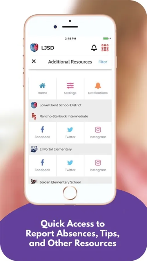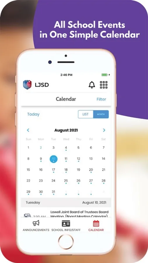 The app includes information for the district and all schools. Filter by the school your child attends to feature information for that school.