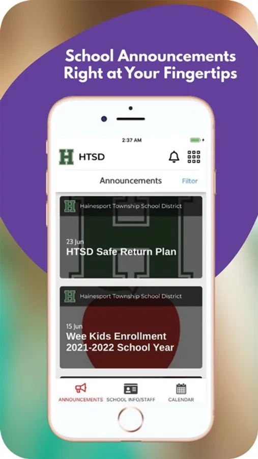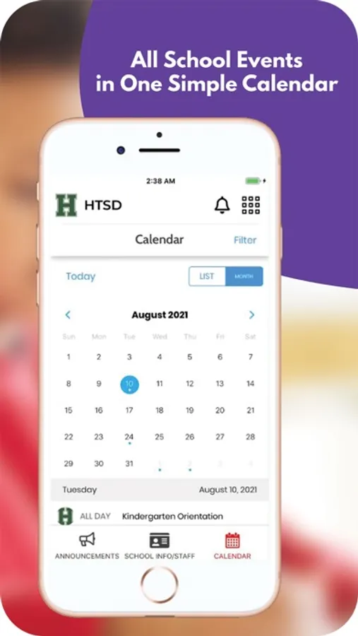 The app includes information for the district and all schools. Filter by the school your child attends to feature information for that school.