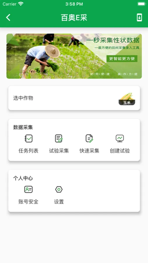 app目前致力服务于个人育种家与企业,目前应用于育种家在田间采集作物性状使用,使育种家能够直接将性状数据采集后发送往后台进行分析.并且包含了其他实用的小工具,以及技术交流的平台.