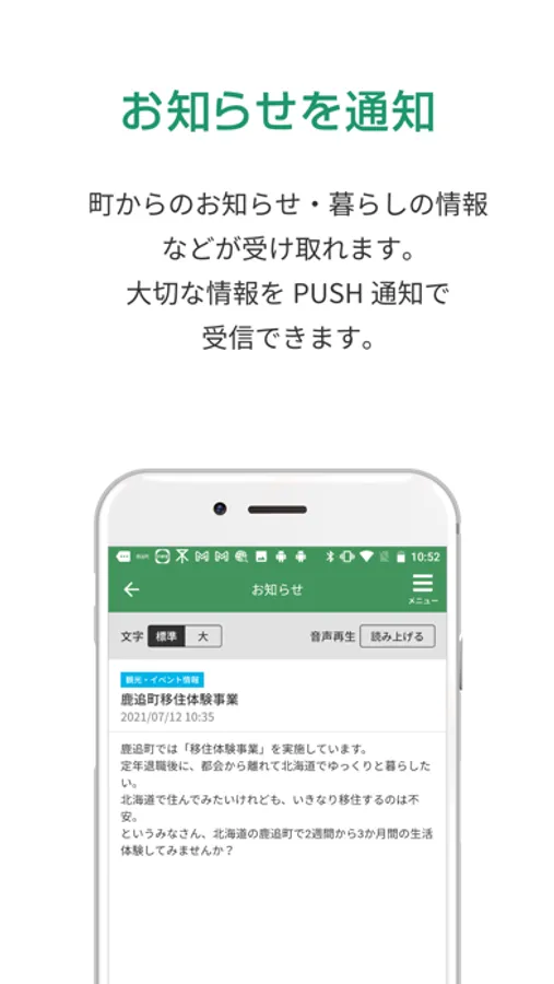 町からのお知らせ、イベント情報など、鹿追町の様々な情報が通知され受け取ることができます。