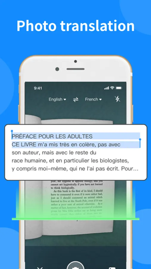 * Camera translation: powerful OCR camera word capture and photo translation functions, one-shot translation, no need to manually input can quickly translate English, Japanese and other languages, meet travel shopping translation, overseas translation, travel translation, English learning translation, etc. demand. Use the camera to translate any picture or text.