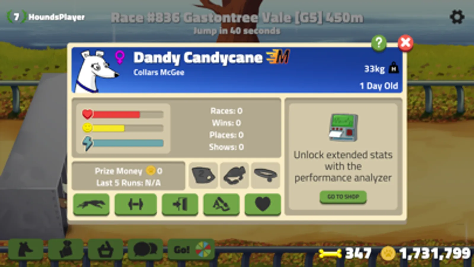 Save up your hard earned cash to buy your own hounds to race and generate income for you.