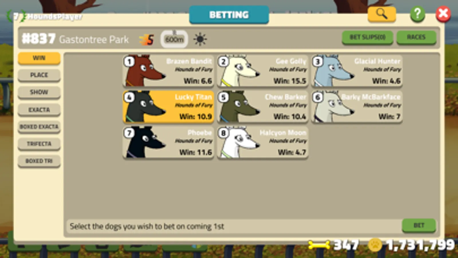Starting out with $2000 to make your bets and buy your own hounds to race. Spin the Wheel of Fury to earn extra cash too!