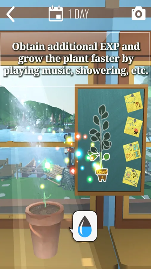 Obtain additional EXP and grow the plant faster by playing music, showering, warming, etc.