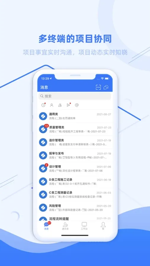 项目参与各方应用手机、电脑、ipad在线文字语音沟通、发送位置、在线预览文件、上传现场照片、发布会议提醒、推送项目指标预警,信息及时同步;项目消息自动推送,精准的信息传递,多终端的数据互通!
