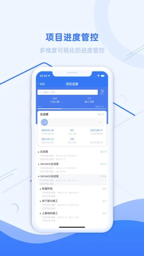 实时查看项目的进度,对于超期的任务设置进度预警推送;关联造价数据、质量数据等,进行多维度的进度形象模拟,对计划进度及实际工期的整体监控。