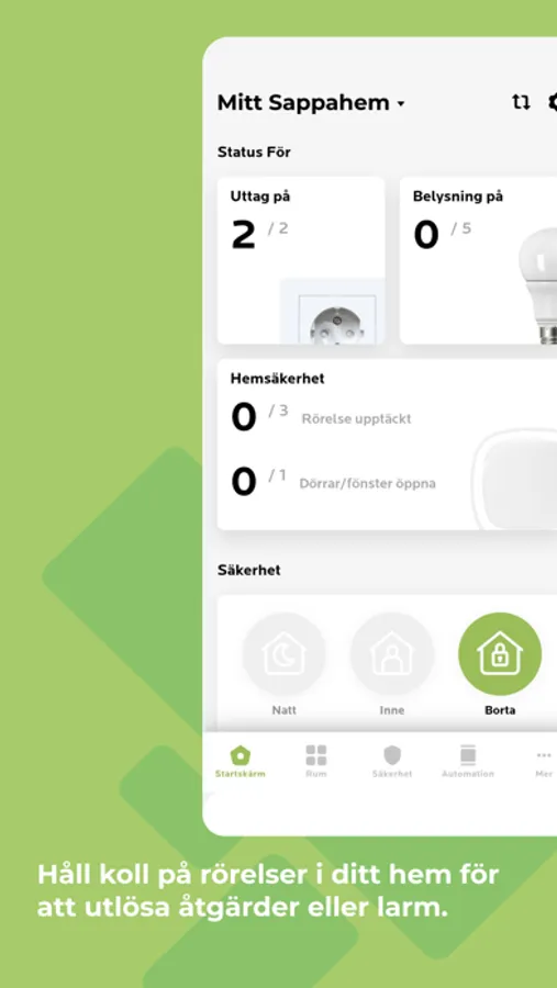 Med Sappa Smarta Hem kan du ligga kvar i sängen medan du slår på TV:n, tänder belysningen och startar kaffebryggaren, eller varför inte få notiser om när barnen går hemifrån och kommer tillbaka? Anpassa belysningen efter tid på dygnet och låt lampan i hallen tända sig själv när du besöker toaletten under natten. Möjligheterna med Sappa Smarta Hem är oändliga.