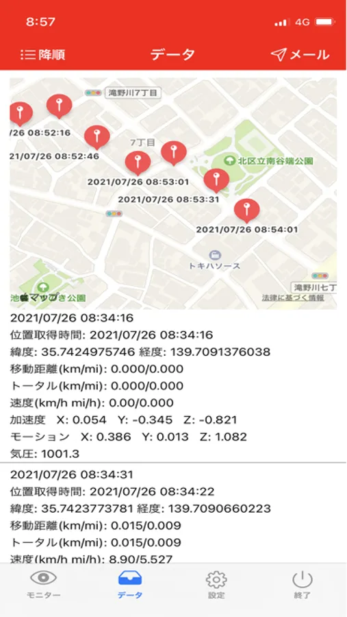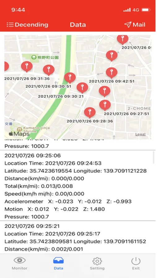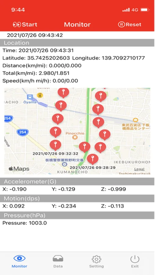 It gets the location, moving distance, speed, accelerometer, motion, and pressure periodically. Users can monitor the data in realtime, refer after tracking, and send by E-mail. Users can also manage the whole data on our server(Users need the contract with us separately)