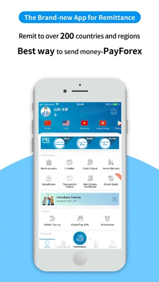 PayForex, provides more low-cost/speedy/secure and simple remittance service. And all procedures are supported online and 24/7, wherever you are.