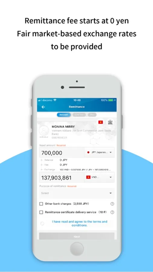 Free of charge when sending a large amount remittance (e.g., over 5,000 USD), and we provide real & transparent exchange rate.