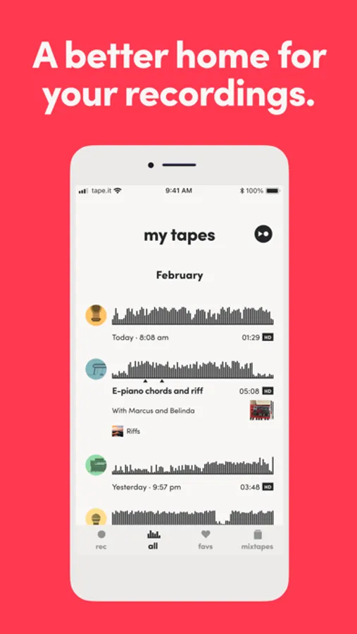 THE professional songwriting app that helps musicians record, organize & share song ideas. We are frustrated musicians that always wanted a straightforward app that gets how we artists work— so we created Tape It. And thousands of professional musicians love it!