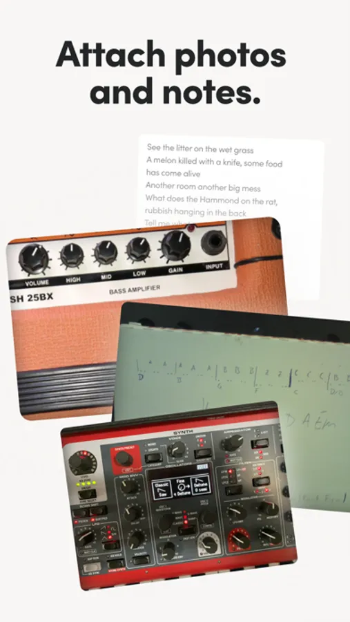 Never lose song memos, never spend time with songwriting headaches again; Focus on what really matters for your music, record many ideas, don’t think too much and unmess your songwriting!
