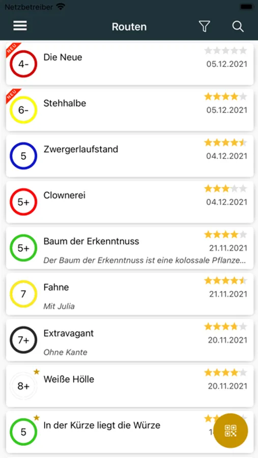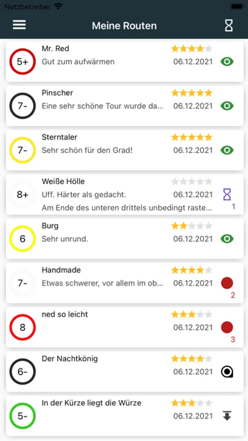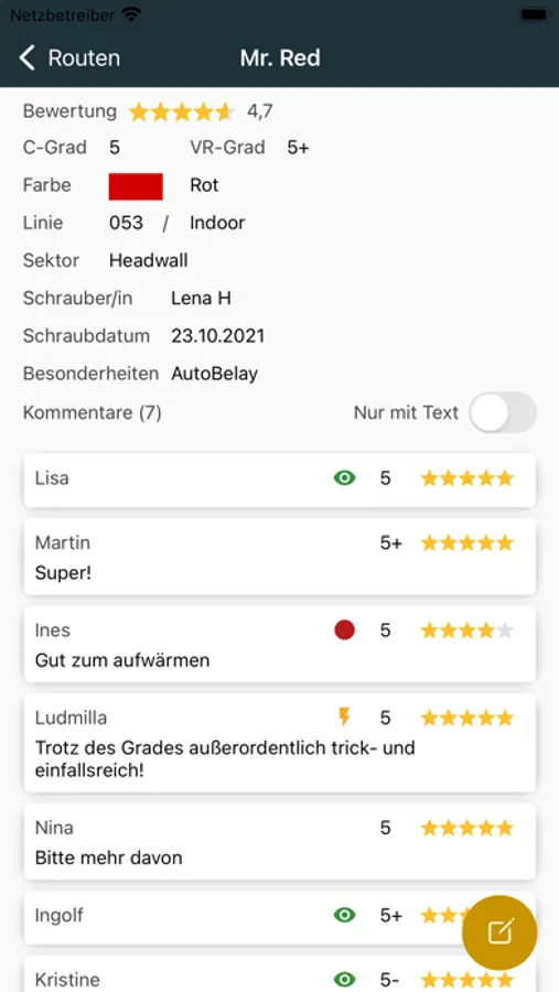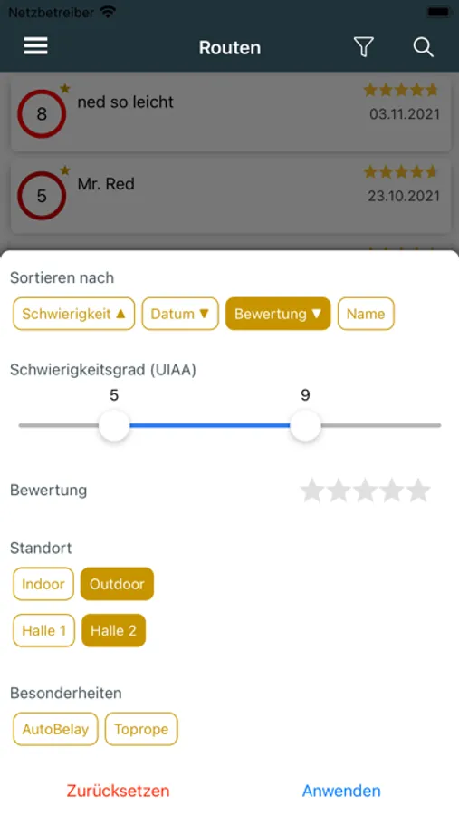 Ihr könnt Routen nach Schwierigkeitsgrad und Schönheit bewerten, eigene Kommentare abgeben und die Kommentare anderer Nutzer vor dem Einstieg lesen. Darüber hinaus könnt ihr eure persönliche Tickliste pflegen um eure Projekte im Auge zu behalten oder noch nicht gekletterte Routen in der Halle zu finden.