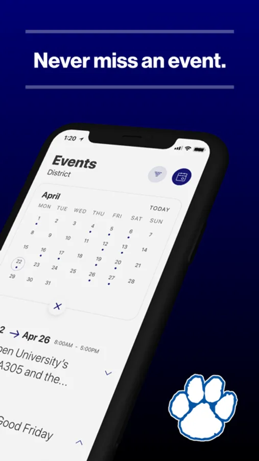 The event section shows a list of events throughout the district. Users can add an event to your calendar to share the event with friends and family with one tap.