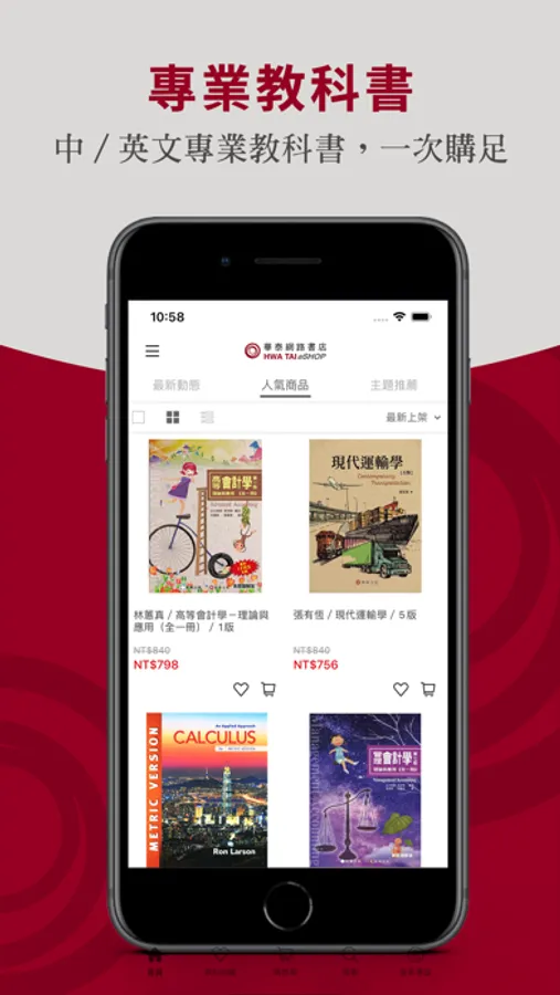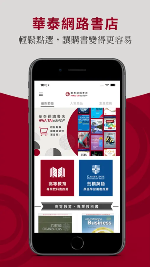 華泰網路書店APP是「華泰文化 Hwa Tai Publishing」的官方訂購商城。「華泰文化」成立於1974年,長年代理多家世界頂尖教育出版社千餘種外文教材,為台灣的專業教材代理與出版公司。我們的商品包含:中∕英文的高等教育專業教科書、劍橋英語學習產品及劍橋官方英檢備考用書。下載APP,立即在我們的官方網路書店輕鬆點選、安心購足各類專門學習用書與產品。