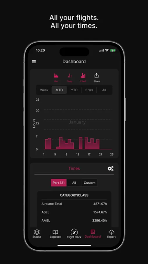 Dashboard - This comprehensive overview of your flight time summarizes and highlights flight time totals based on aircraft category, class, and much more.