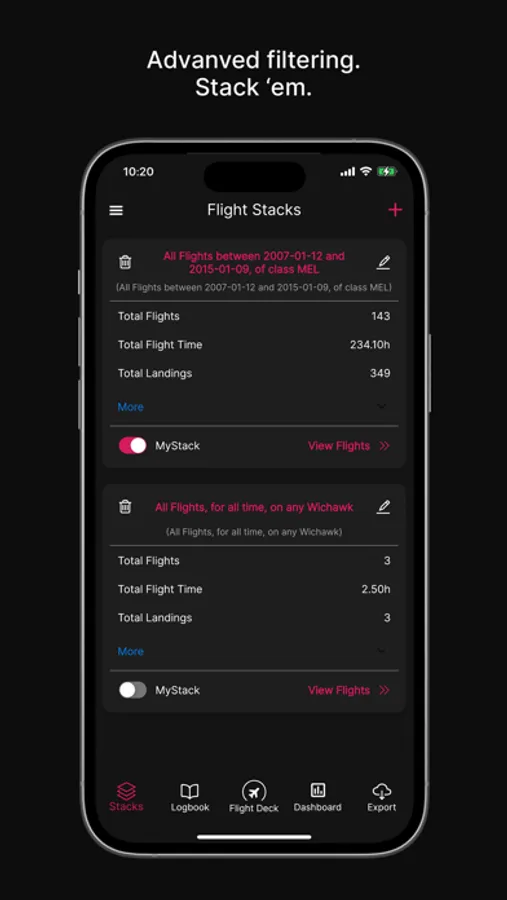 Smart Filtering (Stacks) - Group flights into Stacks by specifying parameters such as route, aircraft model, flight conditions, and more.