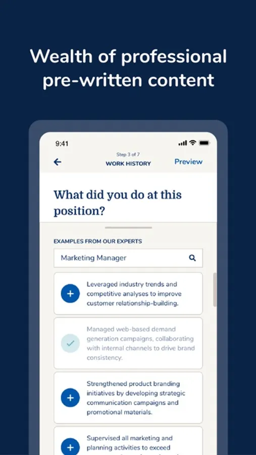 Never get stuck writing your CV again. Our expert CV writers have crafted thousands of phrases and bullet points across hundreds of industries and career paths. Each of them available for you to insert into your CV with a single click or tap.