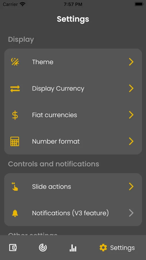Customize every aspect of the app including display currency, number format, swipe actions, Notifications, Language, and more