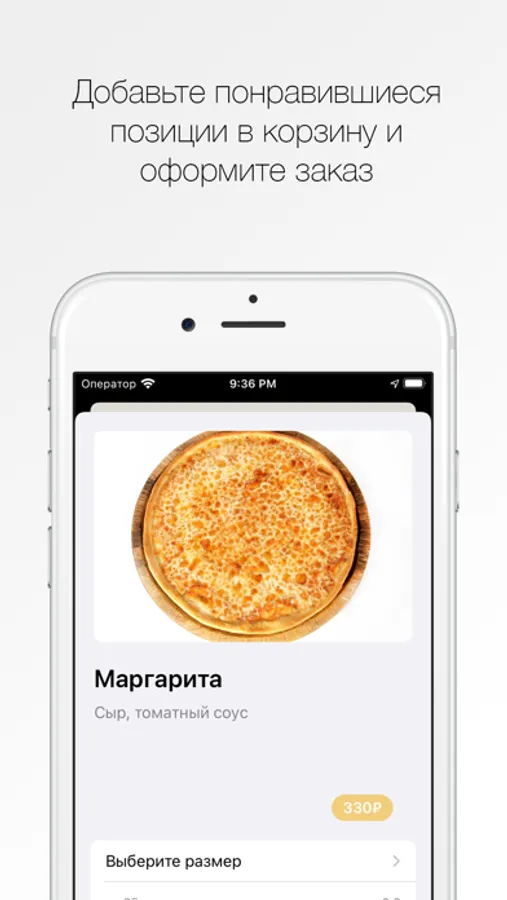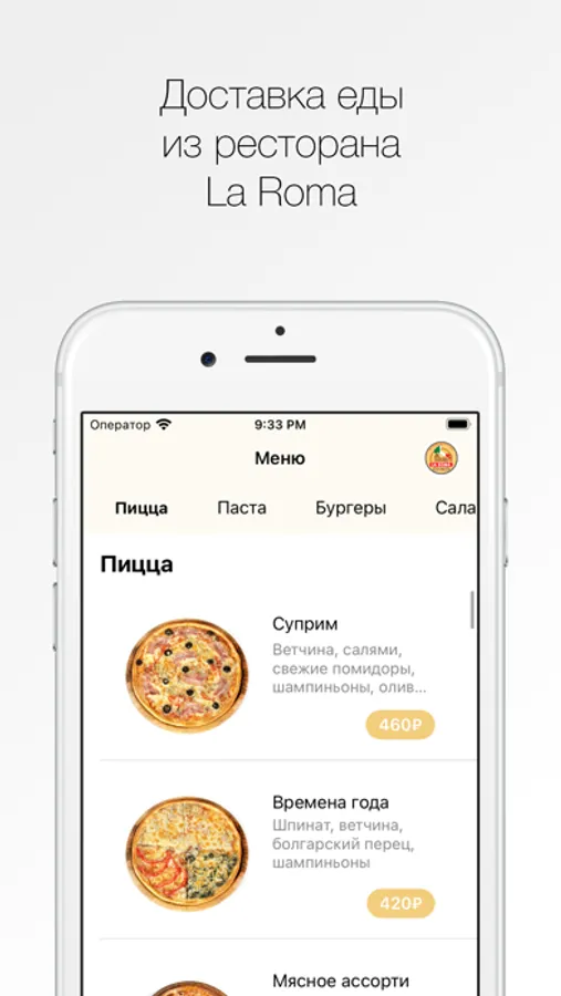 Как сделать заказ в приложении “La Roma”: выберите понравившиеся позиции из меню, добавьте их в корзину и перейдите на экран оформления заказа (по нажатию на иконку корзины).