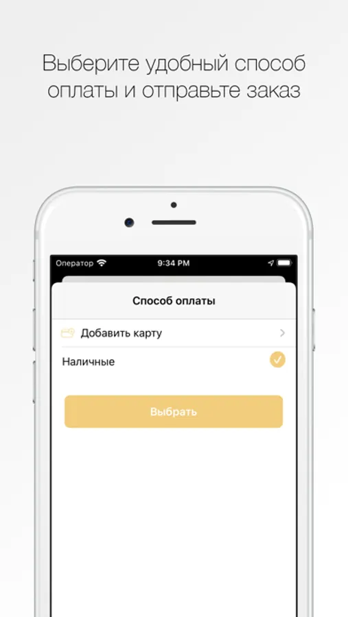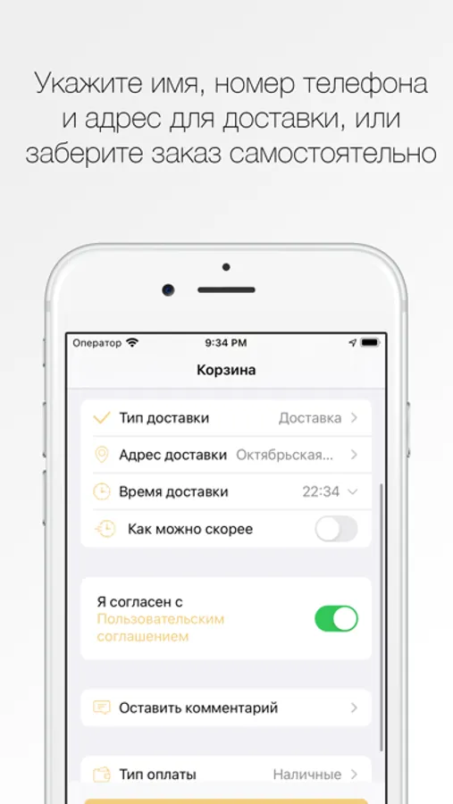 Выберите способ оплаты: Наличными или картой. Примите правила оплаты и нажмите кнопку “Заказать”.