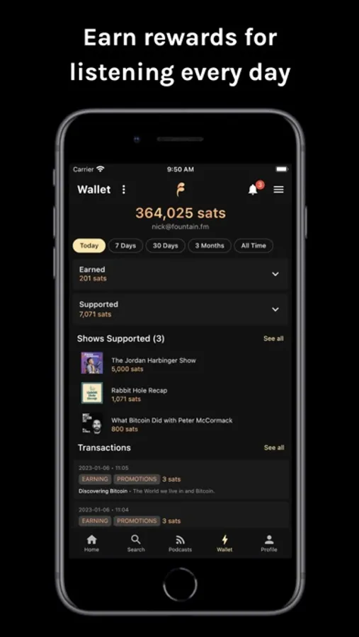 On Fountain, listeners get rewarded too. Earn for your first hour of daily podcast listening. Your rate changes every day and is completely random. Earn even more by listening to promotions from podcasters and advertisers. Withdraw your earnings or use them to start supporting your favourite podcasts.