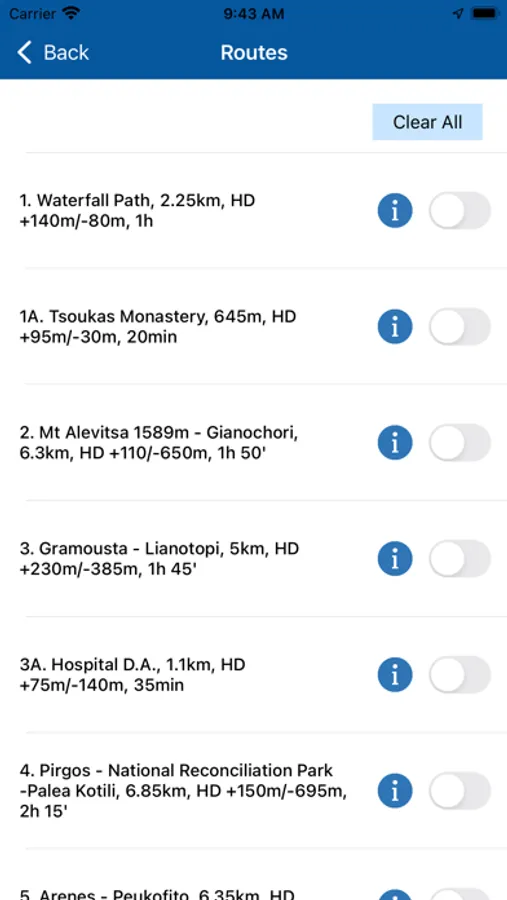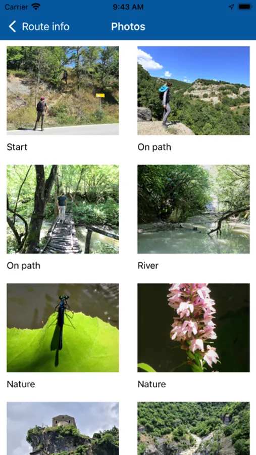 • Proposed routes appear on the map with a color corresponding to the degree of difficulty: easy, intermediate, demanding and very difficult trails are colour-coded as green, blue, red and black respectively.