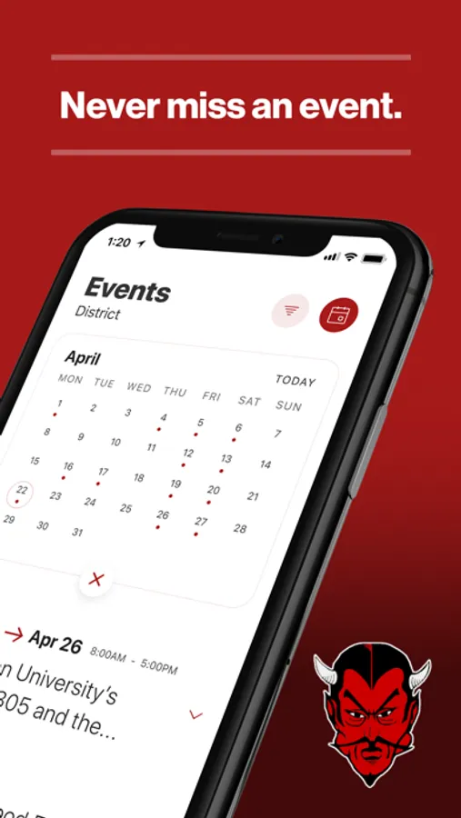 The event section shows a list of events throughout the district. Users can add an event to your calendar to share the event with friends and family with one tap.