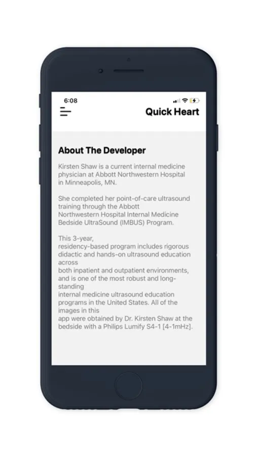 This app was designed for individuals who are learning how to perform and interpret focused bedside echocardiography. It was created to serve as an efficient bedside assistant to verify what appropriate views and common pathologies look like while one continues to hone their spatial and physiologic understanding of cardiac ultrasound. This app is best used as a reference early on in one’s training and for teaching others at the bedside.