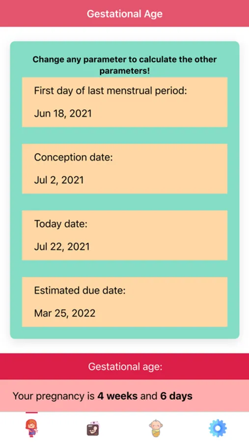 - Precise pregnancy parameters calculation with most commonly used formula.