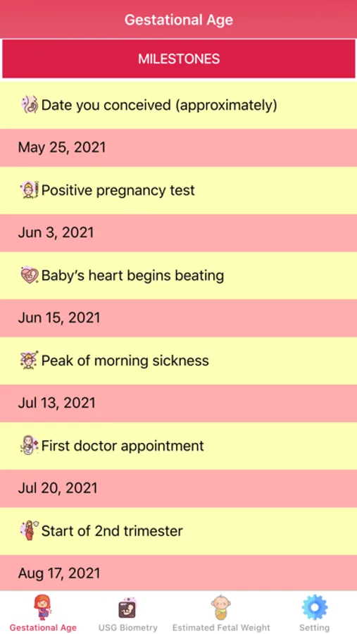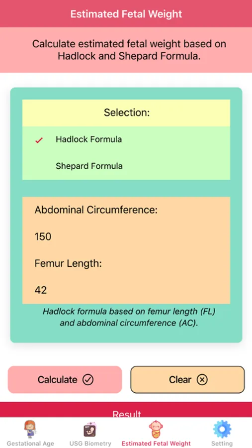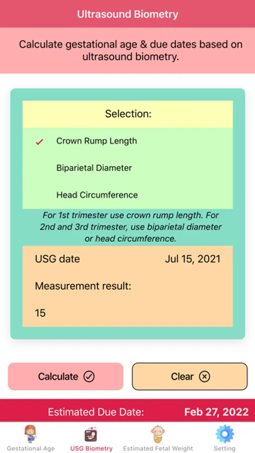 "Pregnancy Calculator Pro: Maternity and Motherhood" will calculate gestational age and estimated date of delivery (EDD) / due date based on last menstrual period (LMP). The users also could use several ultrasonography (USG) biometrics to calculate gestational age and estimated date of delivery (EDD). Ultrasonography (USG) biometrics used are crown-rump length (CRL), biparietal diameter (BPD), and femur length (FL). "Pregnancy Calculator Pro: Maternity & Motherhood" also has a feature to estimate fetal weight with Hadlock or Shepard formula.