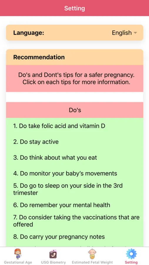 "Pregnancy Calculator Pro: Maternity and Motherhood" also provides useful recommendations and tips for pregnancy. Pregnant women could find recommended antenatal visitation schedule to the obstetrician, immunisation schedule, and weight gain during pregnancy. Pregnant woman also could find recommended healthy diet, vitamin, minerals, and exercise during pregnancy. Because of these, "Pregnancy Calculator Pro: Maternity and Motherhood" is not just recommended for healthcare practitioner but also for all pregnant women widely.