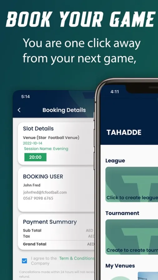 Tahadde app is a booking platform for all football pitches in the UAE. We have put together the perfect package to help you take your passion, sport, and energy and transition all of that into real-world actions. The app helps users to find available pitches, get directions to the pitch and book your game, anytime anywhere. You will be able to create leagues, plan events, invite players, book pitches, and most importantly play the beautiful game.