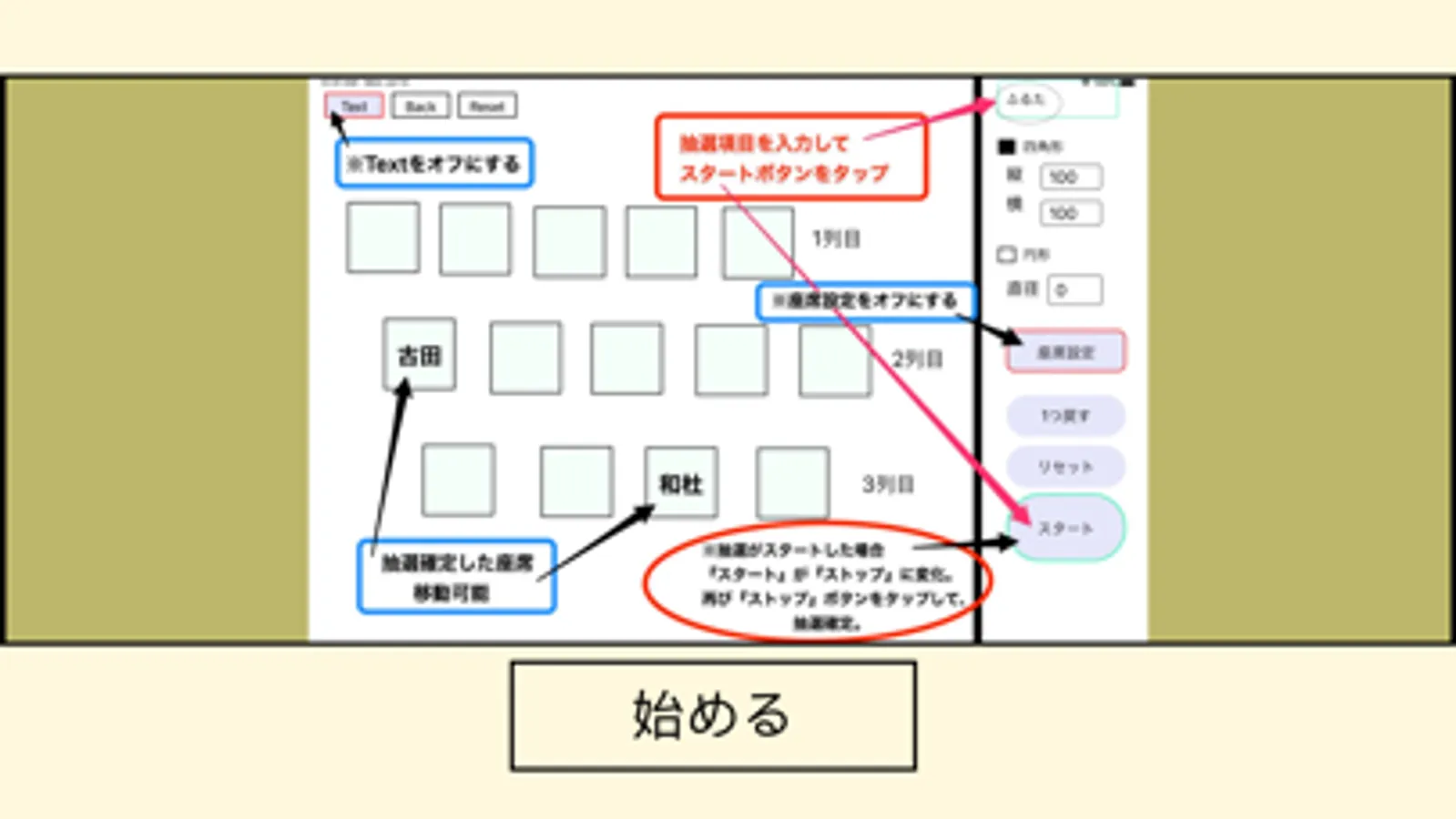iPad・iPhoneで『席決め』や『役割決め』などを【Start&Stop抽選】で行ないます。