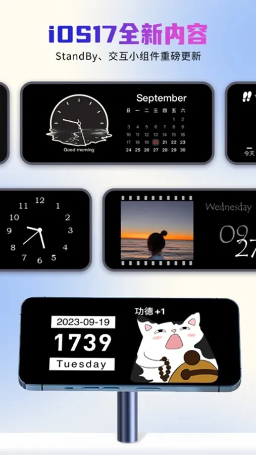 300+小组件自由组合,已有:照片、打工人时钟、待办清单、X面板、倒数日、时钟、太空人表盘、日历、语录、小目标、习惯养成、今日步数、睡眠时长等等。