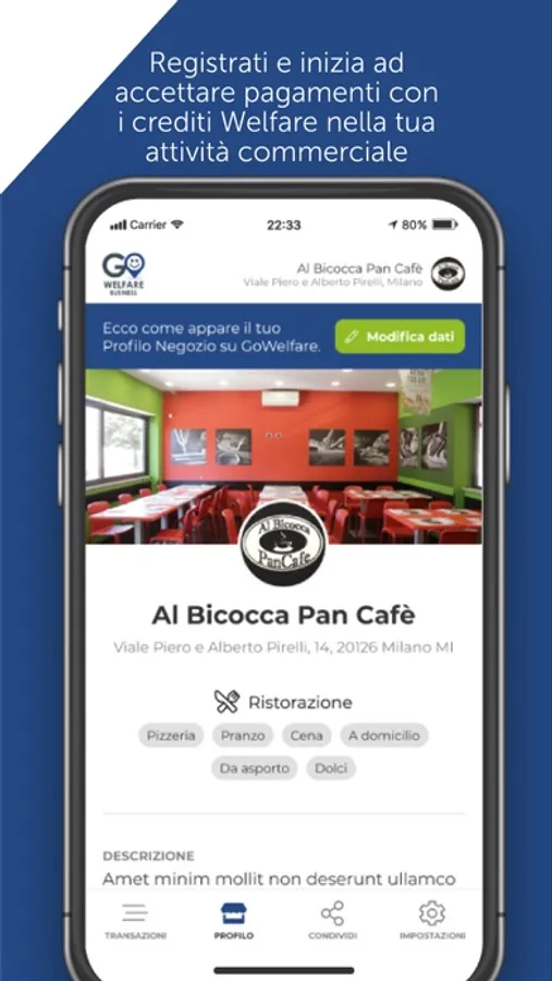 L'app GoWelfare consente a coloro che hanno un'attività commerciale di vendere i propri beni e servizi ai dipendenti delle aziende che offrono un piano Welfare, ricevendo il pagamento tramite bonifico bancario.