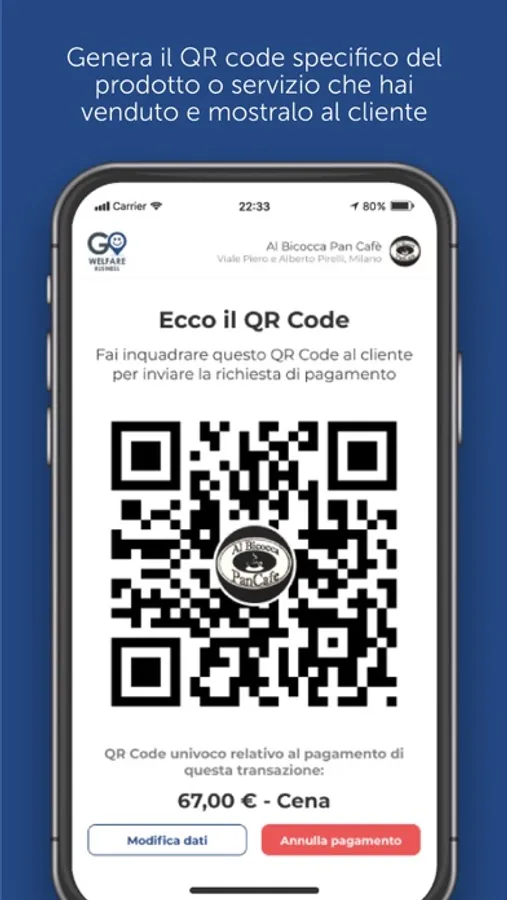 Per accettare pagamenti con crediti welfare nel tuo punto vendita, ti basterà generare il QR code specifico del prodotto o servizio che hai venduto, e mostrarlo al cliente. Segui questi 3 semplici passaggi: