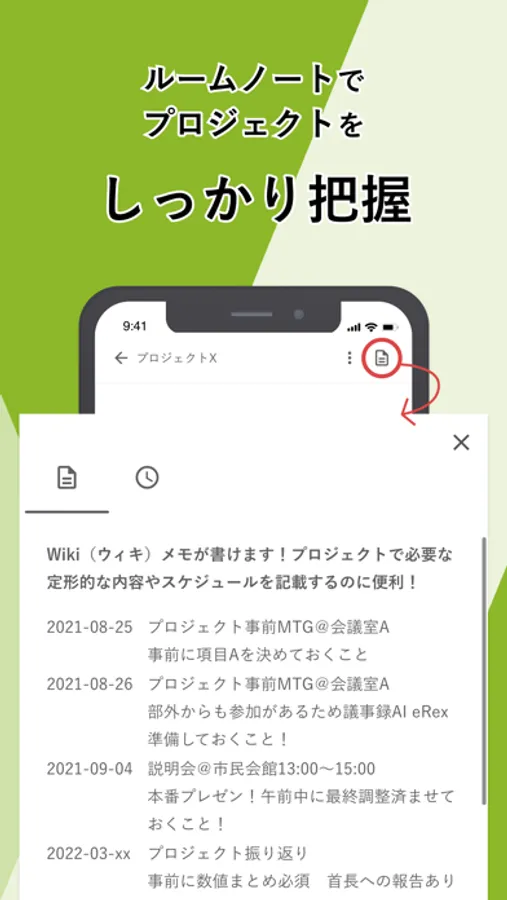 ルームごとに常に表示しておきたい全体タスクや手順などを記載可能なWiki(メモ)を作成可能