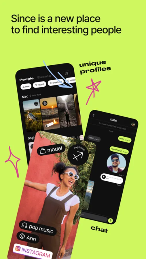 Since App is a new place to explore interesting people and find new friends. Our app has a friendly and open atmosphere, where everyone can find someone. Get inspired and filled with meeting and exploring interesting people, discover new things with them, and share experiences. It is more than a dating app. Create your story together with your matches in our new creative chat.