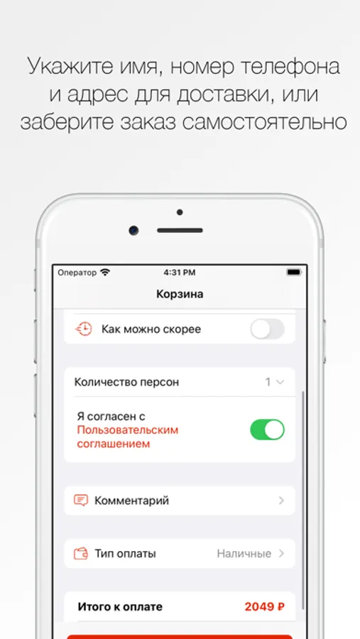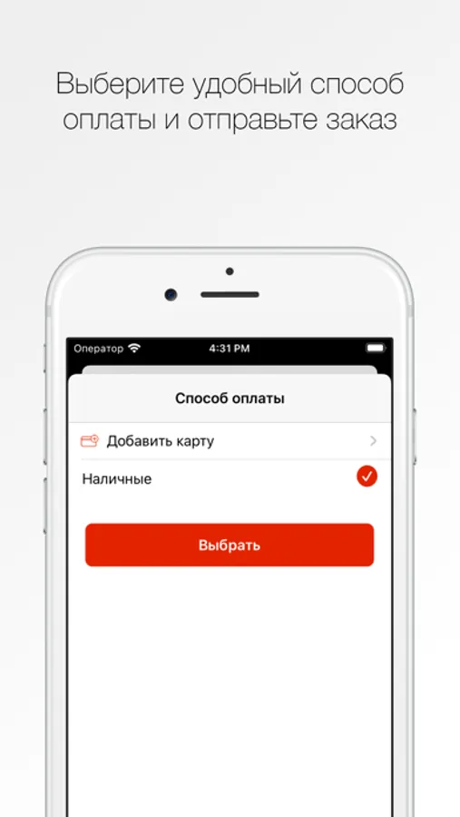 Выберите способ оплаты: Наличными или картой. Примите правила оплаты и нажмите кнопку “Заказать”.