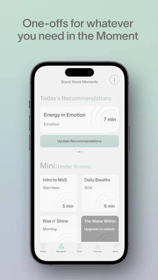 Our comprehensive Moments bank offers stand-alone meditations from 4 to 30 minutes, catering to your unique needs. From sessions for sleep, anxiety, and stress, to those that deepen your awakening experience, we've got you covered.