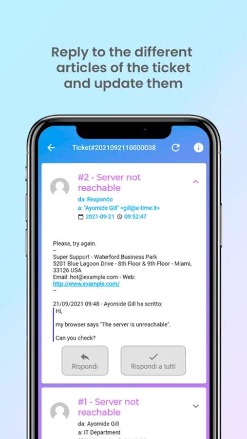 - see the details of the conversation of a ticket, i.e. the list of all articles with sender, recipients, text, attachments, date-time of sending