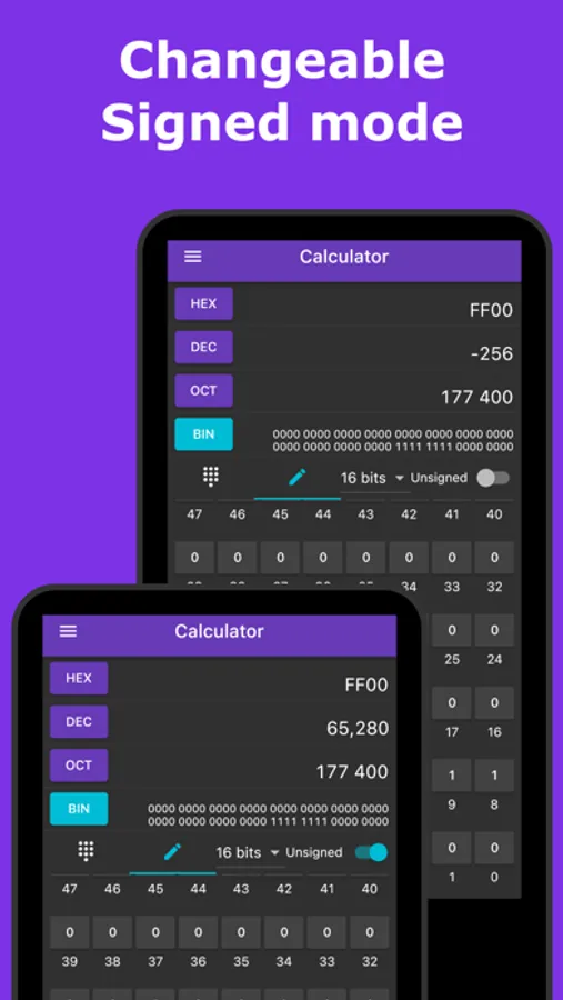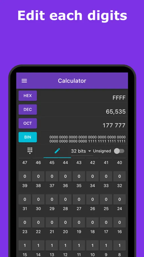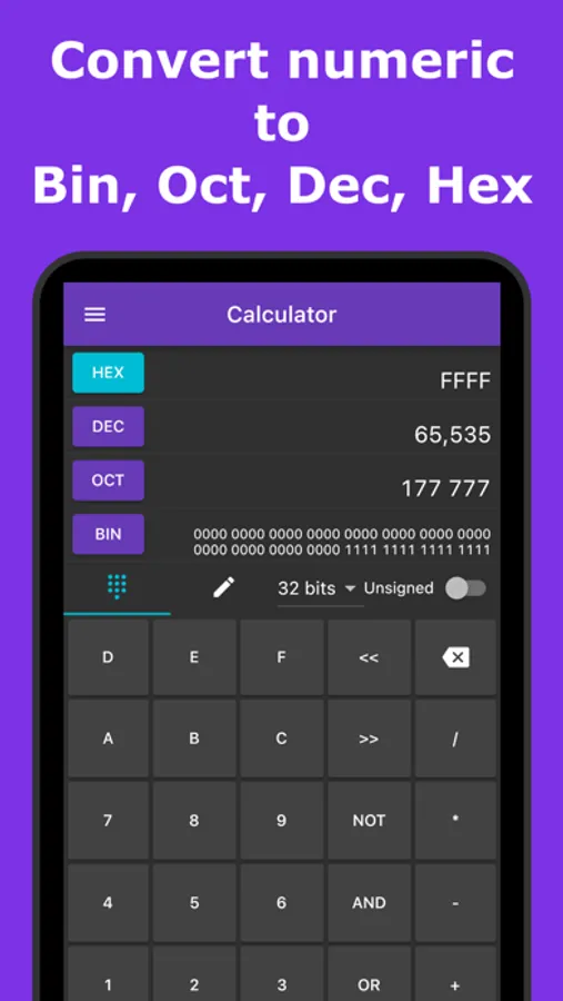 - Convert numeric to binary, octal, decimal, hex immediately.