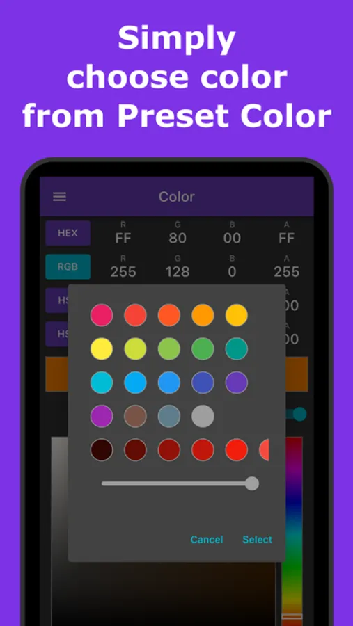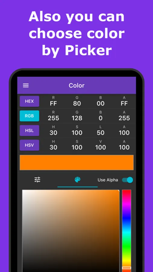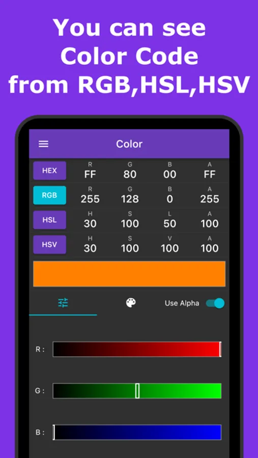 - You can get color code from RGB, HSL, HSV and Color Picker.